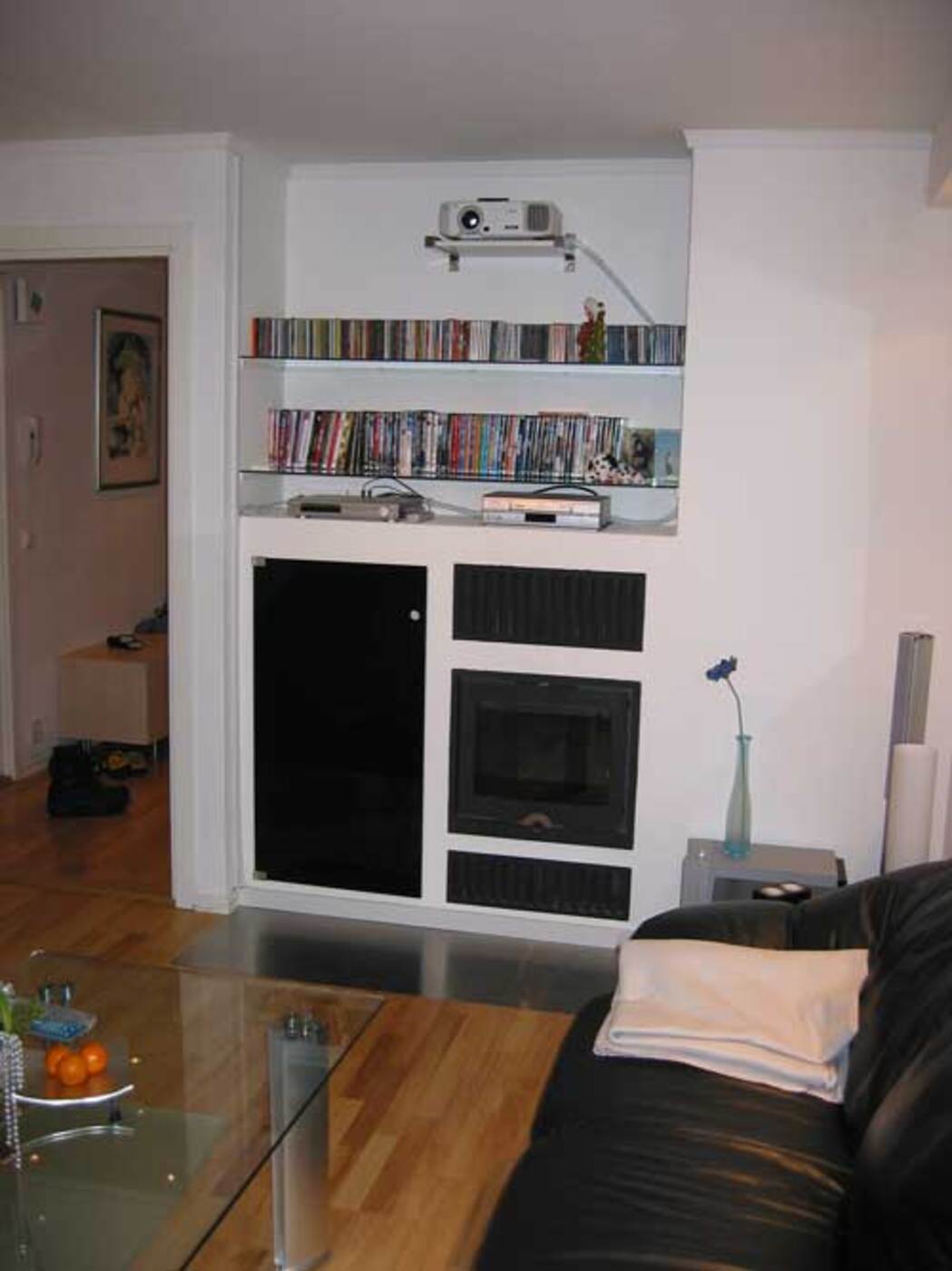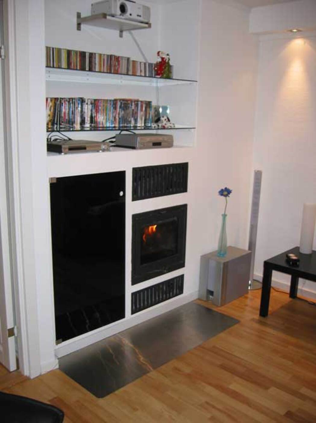 49 - Pusset rettveggspeis(brettskuret) Hele fronten er i et plan.Spesiallagde ventiler tilpasset innsatsen.Sotet glassdør foran vednisjen.Rustfri plate på gulv.Jøtul I160 peisinnsats.